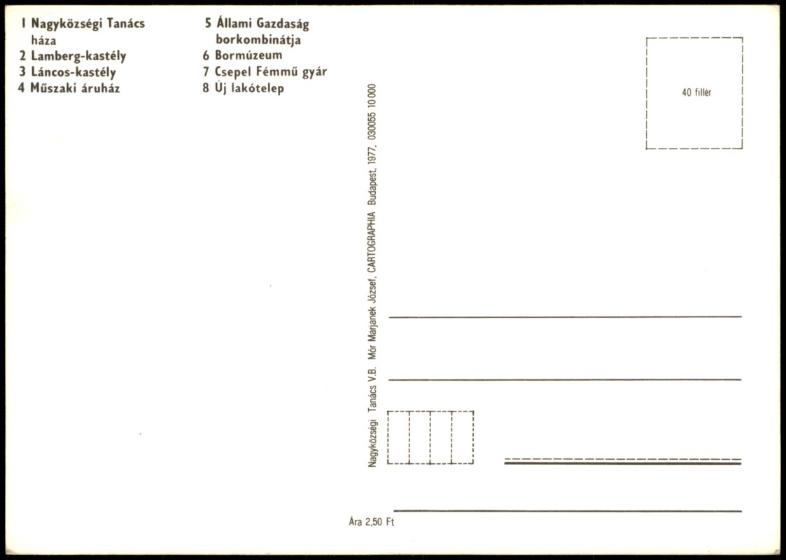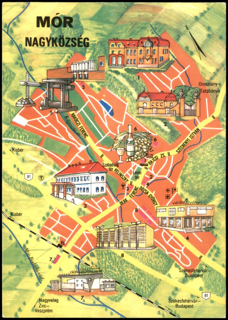 - Farbig illustrierte Karte von Mór (Ungarn), gestaltet als Ortsplan mit künstlerischen Darstellungen wichtiger Gebäude. Die Karte enthält eine nummerierte Legende (1-8) auf der Rückseite, die folgende Orte benennt: 1. Rathaus (Nagyközségi Tanács), 2. Schloss Lamberg (Lamberg-kastély), 3. Schloss Láncos (Láncos-kastély), 4. Technisches Kaufhaus, 5. Weinkombinat, 6. Weinmuseum, 7. Csepel Metallwerke und 8. Neue Wohnsiedlung. Zudem sind Straßennamen und Richtungsangaben zu Nachbarorten wie Kisbér und Székesfehérvár verzeichnet. Grafik von Marjanek József.