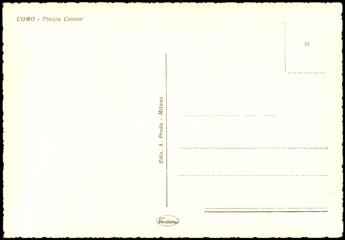 - Colorierte Ansicht der Piazza Cavour in Como. Am linken Bildrand ist das Hotel Metropole sichtbar. Der Platz öffnet sich zum Hafenbecken des Comer Sees, in dem zahlreiche Ruderboote und ein größerer Dampfer liegen. Im Hintergrund sind die bewaldeten Hänge der Alpen zu erkennen. Die Karte wurde vom Verlag A. Preda in Mailand unter der Marke 'Cecami' veröffentlicht.