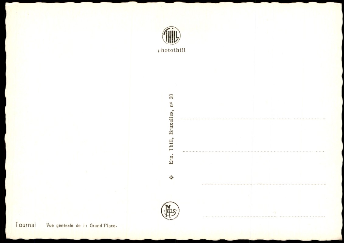 - Schwarz-Weiß-Fotografie der Grand Place in Tournai. Die Ansicht zeigt den weitläufigen Marktplatz mit der im Hintergrund markanten Kathedrale Notre-Dame (fünf Türme) und dem mittelalterlichen Belfried. Im Vordergrund ist ein Parkplatz mit Automobilen der 1950er und 1960er Jahre zu sehen, darunter ein VW Käfer. Die Karte wurde vom Verlag Ern. Thill in Brüssel unter der Nummer 20 herausgegeben und trägt zudem das Logo 'ELS' (Editions Le Sillon).