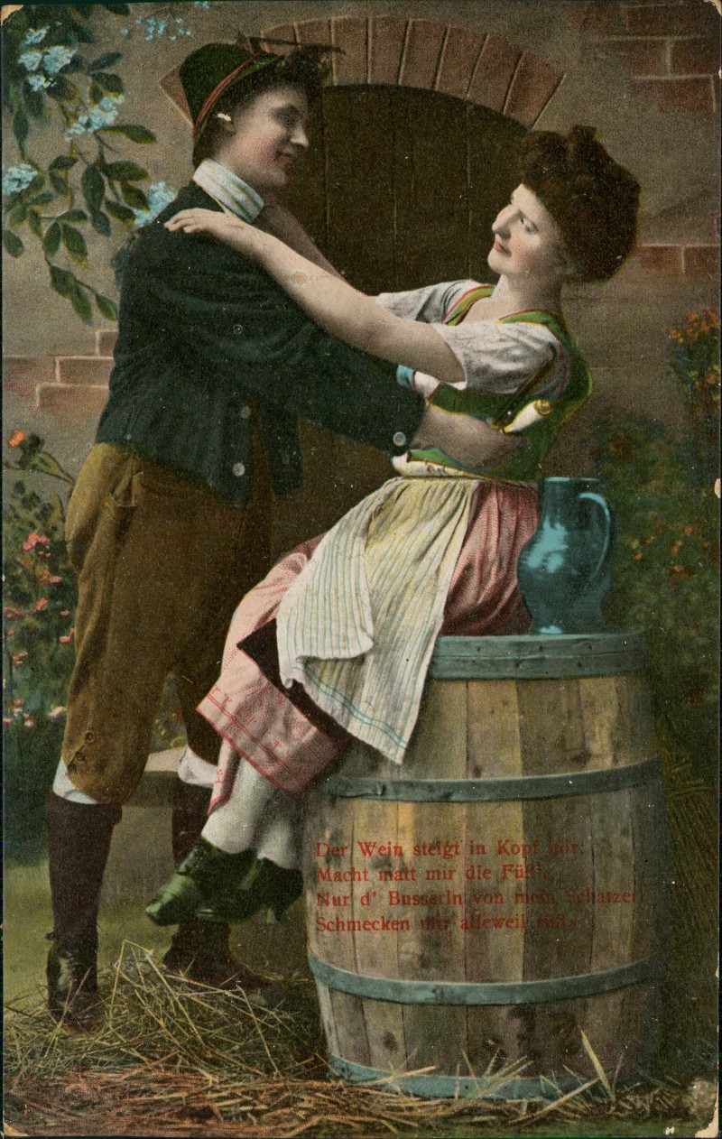 - Liebe Liebespaar Love in Tracht auf Weinfass Der Wein...