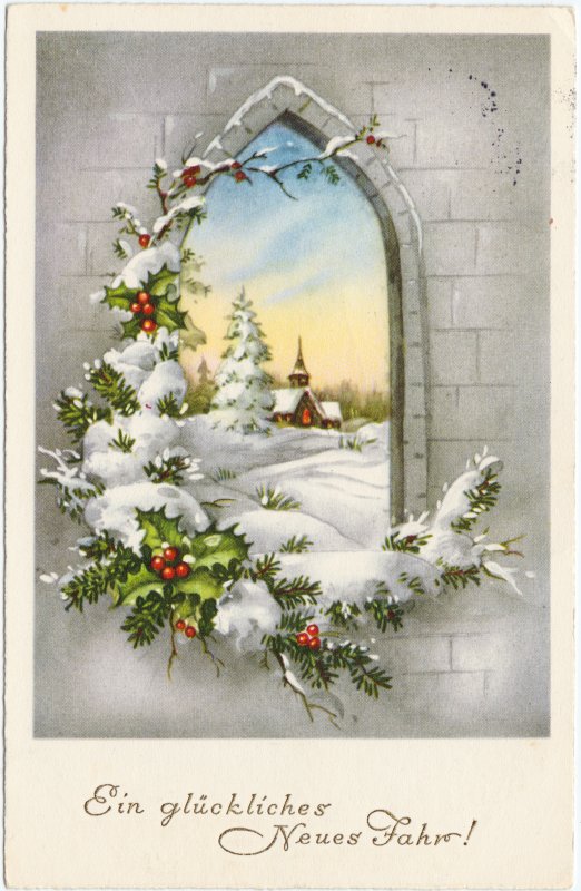 Ansichtskarte: Neujahrsgrüße: Blick aus dem Turmfenster auf Winterlandschaft