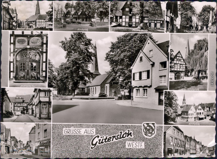 Ansichtskarte: Straßen-Ansichten - Berliner Straße, Kirchplatz, Meiers Mühle, Münster Straße, Stahl'sche Tür, Alter Kirchplatz, Gasse, Kirchplatz, Berliner Straße, - Gütersloh