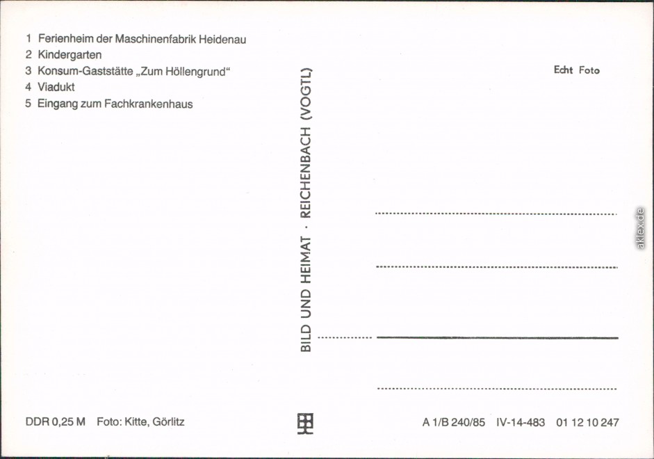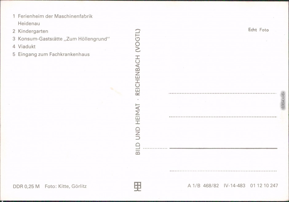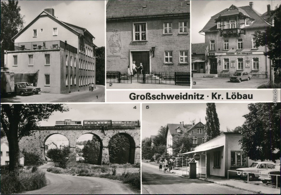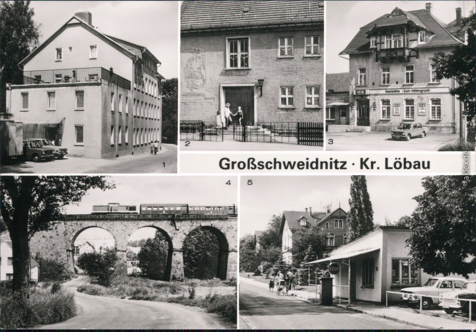 Ansichtskarte: 1. Ferienheim der Maschinenfabrik Heidenau, 2. Kindergarten, 3. Konsum-Gaststätte "Zum Höllengrund", 4. Viadukt, 5. Eingang zum Fachkrankenhaus - Großschweidnitz (OL)
