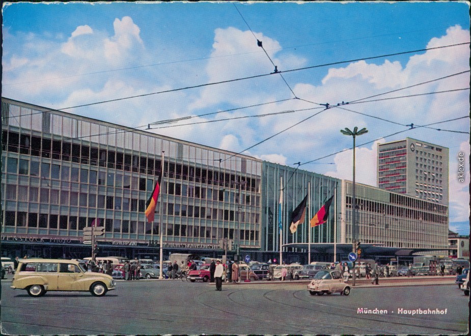 Ansichtskarte: Hauptbahnhof - Außenansicht mit Verkehr (Pkw's) davor - München