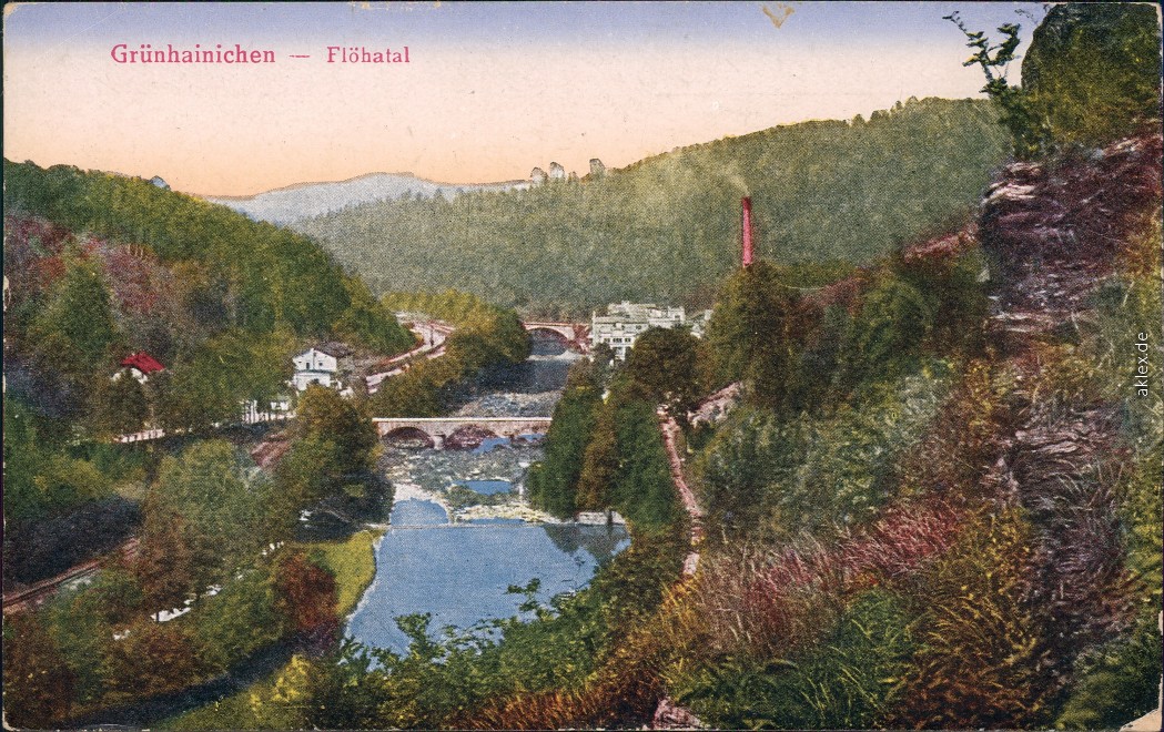Ansichtskarte: Flöhatal mit Brücken und Bahnstrecke - Grünhainichen
