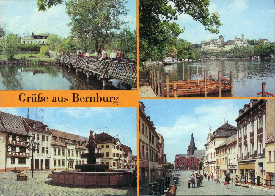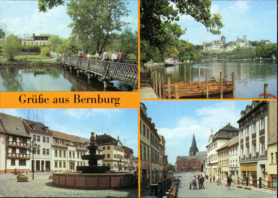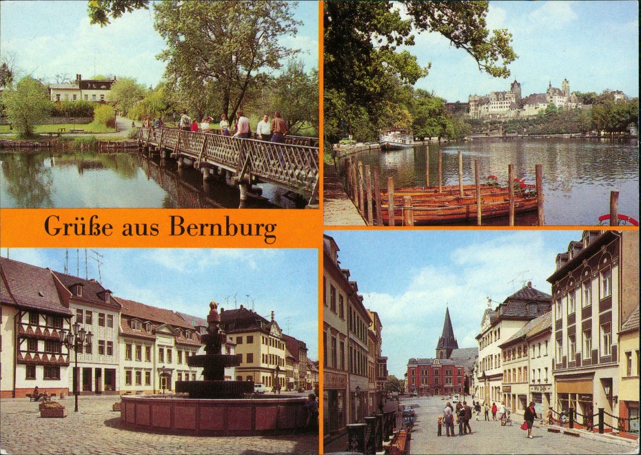 Ansichtskarte: HO-Café "Bärenburger", Blick zum Schloß, Thälmannplatz, Blick zur Marienkirche - Bernburg (Saale)