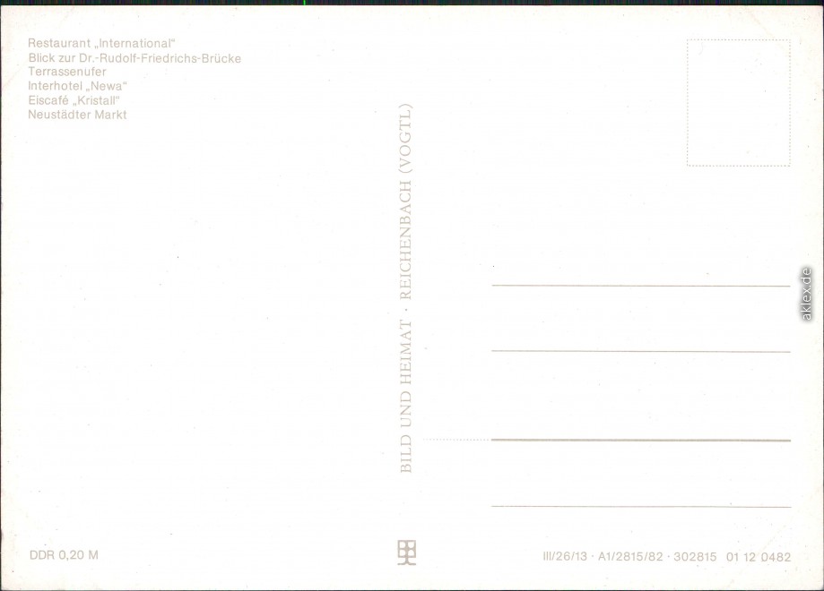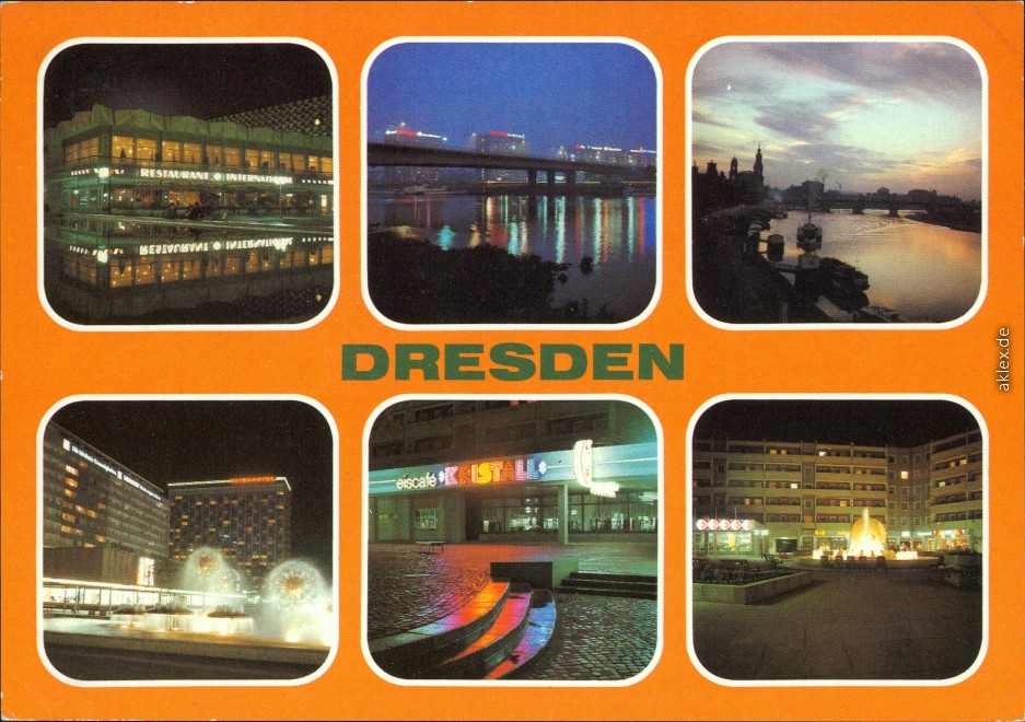 - Restaurant "International", Blick zur Dr.-Rudolf-Friedrichs-Brücke, Terrassenufer, Interhotel "Newa", Eiscafé "Kristall", Neustädter Markt