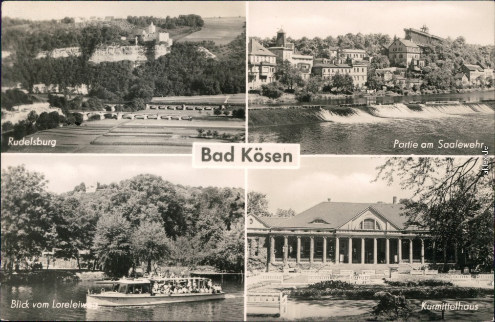 Ansichtskarte: Rudelsburg, Partie am Saalewehr, Blick vom Loreleiweg, Kurmittelhaus - Bad Kösen