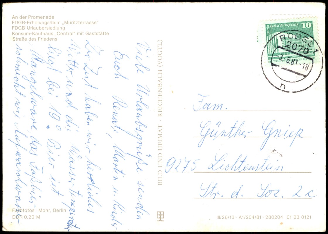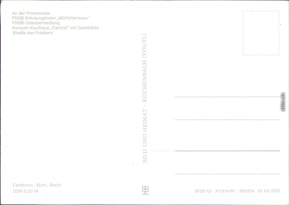 - An der Promenade, FDGB-Erholungsheim Müritzterrasse, FDGB-Urlaubersiedlung Central mit Gaststätte, Straße des Friedens