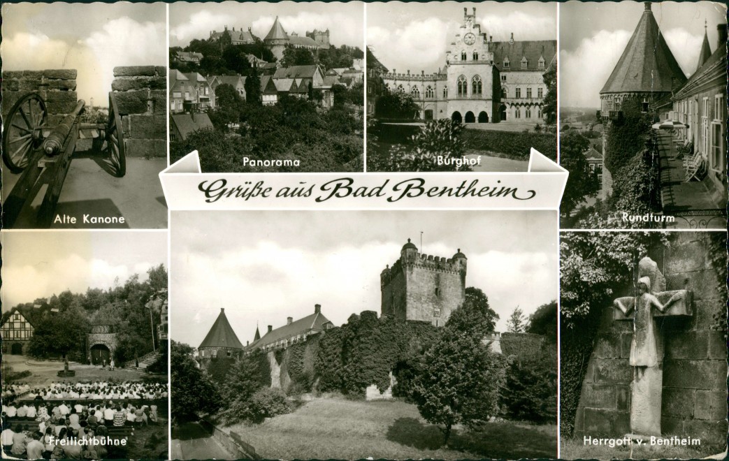 Ansichtskarte: Grüße aus.., Alte Kanone, Burghof, Rundturm, Freilichtbühne, Herrgott v. B. - Bad Bentheim