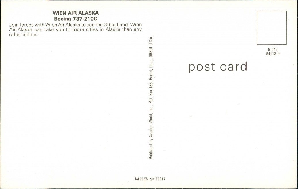 - WIEN AIR ALASKA Boeing 737-210C Join forces with Wien Air Alaska to see the Great Land. Wien Air Alaska can take you to more cities in Alaska than any other airline. B-042 84113-D post card Published by Aviation World, Inc., P.O. Box 188, Bethel, Conn. 06801 U.S.A. N4905W c/n 20917