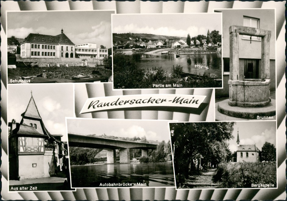 Ansichtskarte: MB: Schule, Brunnen, Autobahn - Randersacker