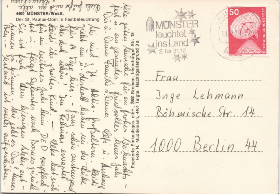 Foto Karte: St.-Paulus-Dom in Festbeleuchtung am Abend/Nacht - Münster (Westfalen)