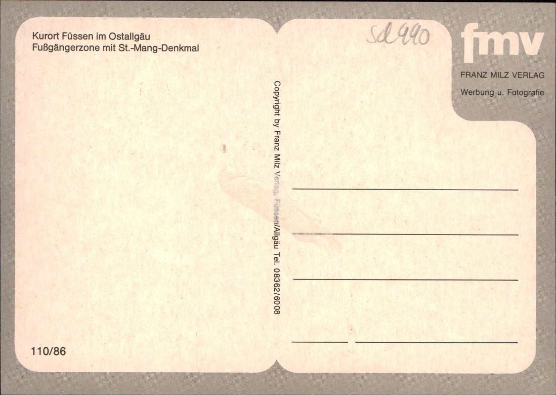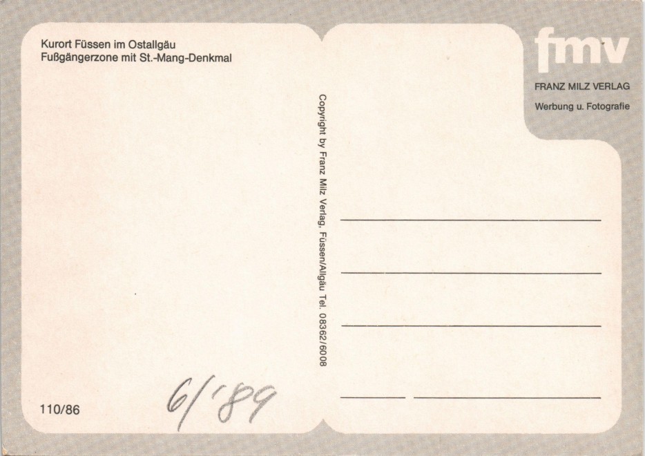 - Ansichtskarte Füssen Fußgängerzone mit St.-Mang-Denkmal 1986
