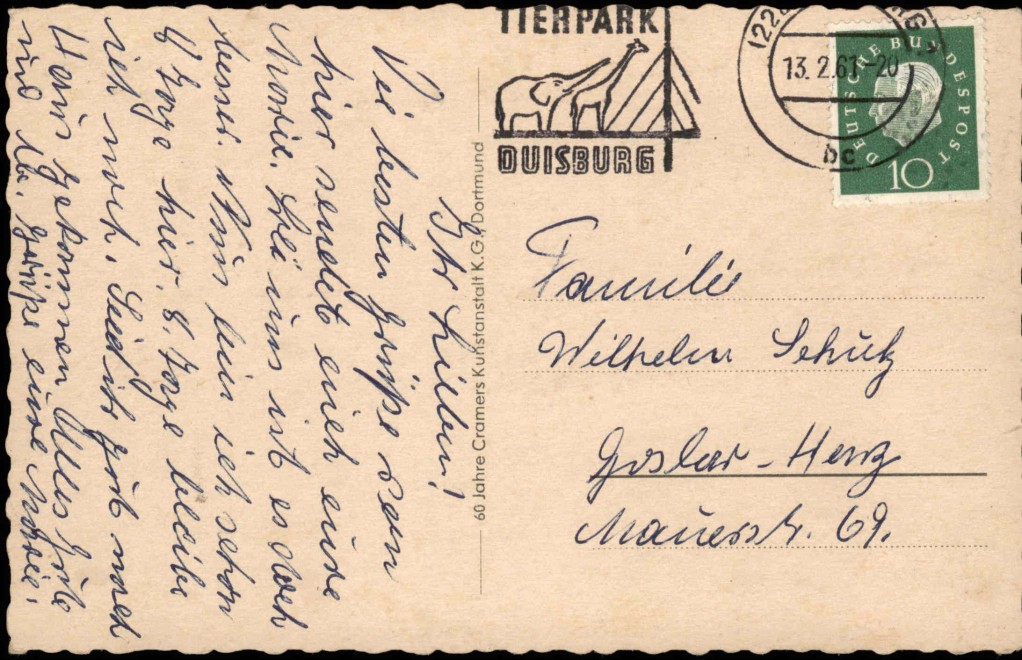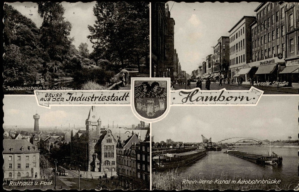 Ansichtskarte: Jubiläumshain, Weseler Straße, Post, Autobahnbrücke - Hamborn-Duisburg