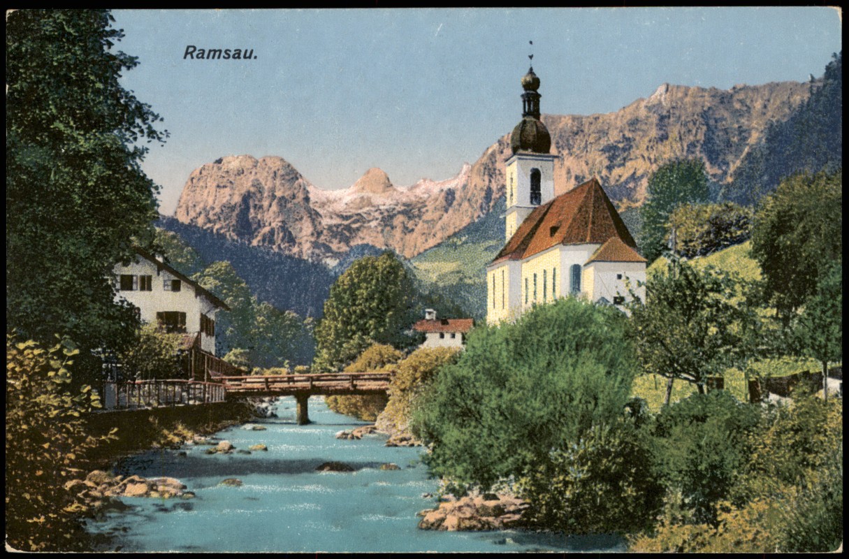 Ansichtskarte: Panorama-Ansicht, Fluss Partie, Kirche - Ramsau bei Berchtesgaden