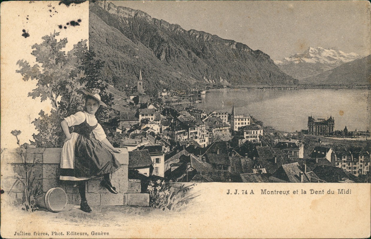 Ansichtskarte: Totale - Frau in Tracht - Montreux (Muchtern)