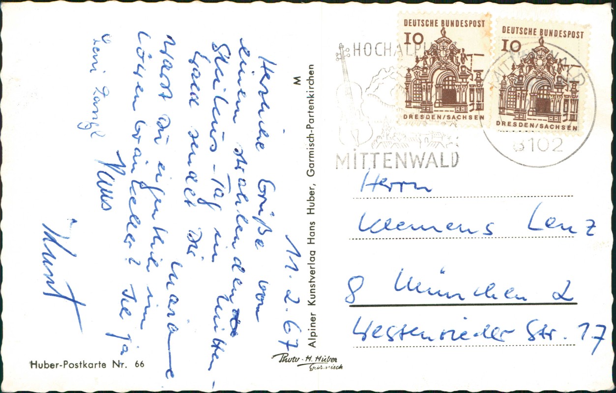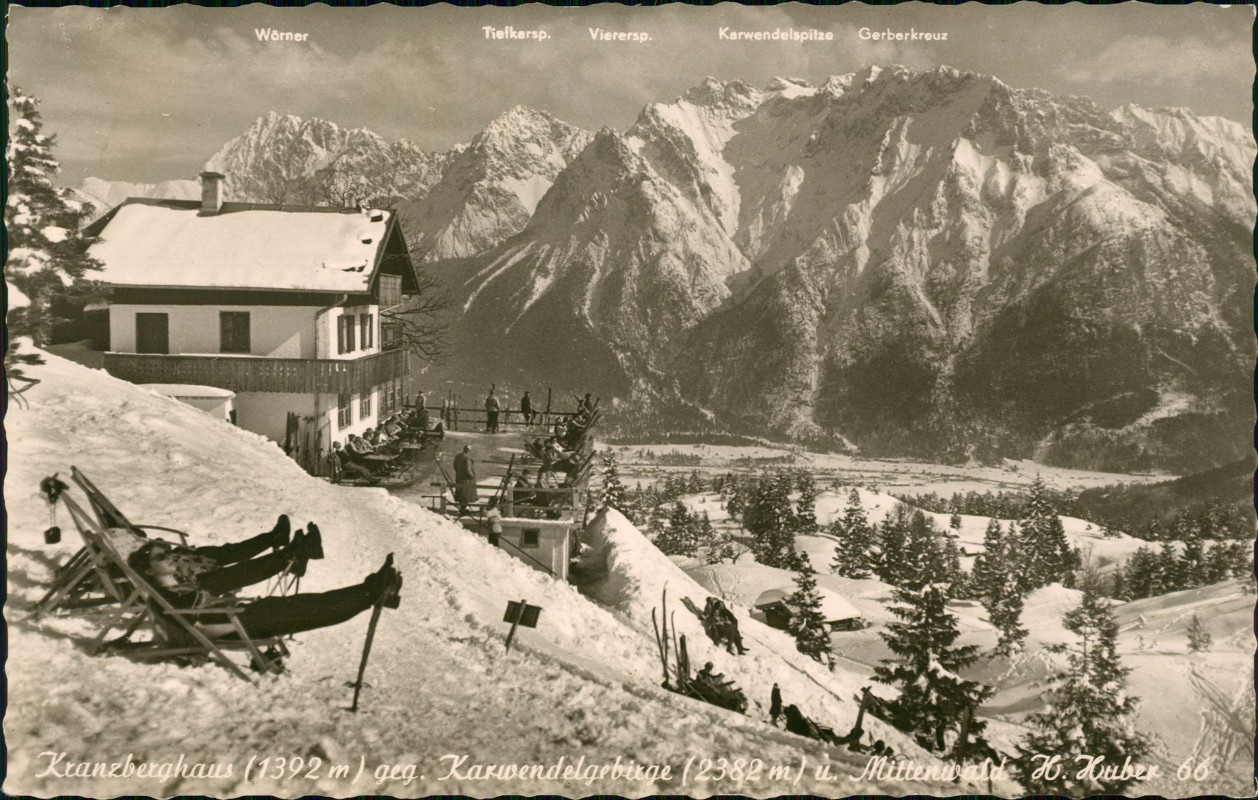 Ansichtskarte: Kranzberghaus (1392 m) Skifahrer - Mittenwald