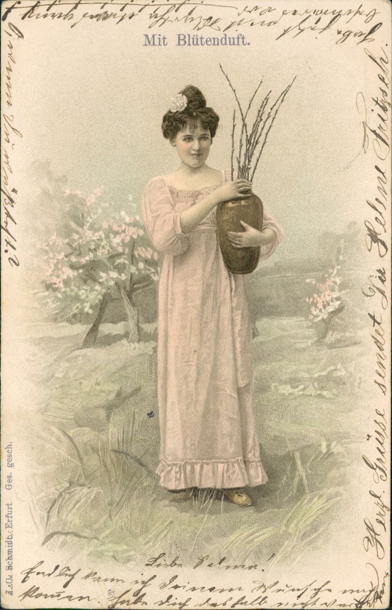 - Künstlerkarte Frau mit Zweigen, Postkarte mit Blütenduft