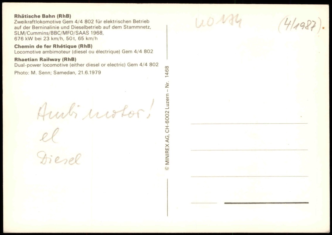 Foto Karte: Rhätische Bahn Zweikraftlokomotive Gem 4/4 802 für elektrischen Betrieb auf der Berninalinie