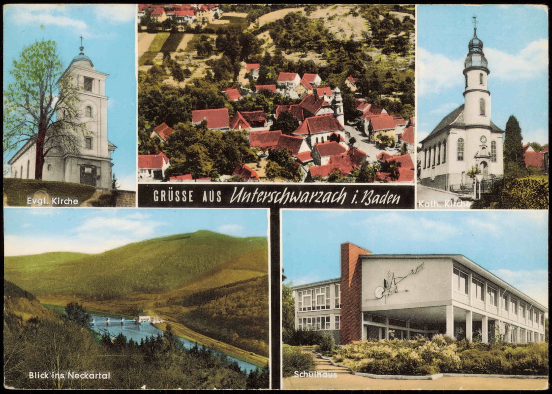 Foto Karte: Mehrbildkarte mit Kirche, Neckartal, Schulhaus - Unterschwarzach (Baden)