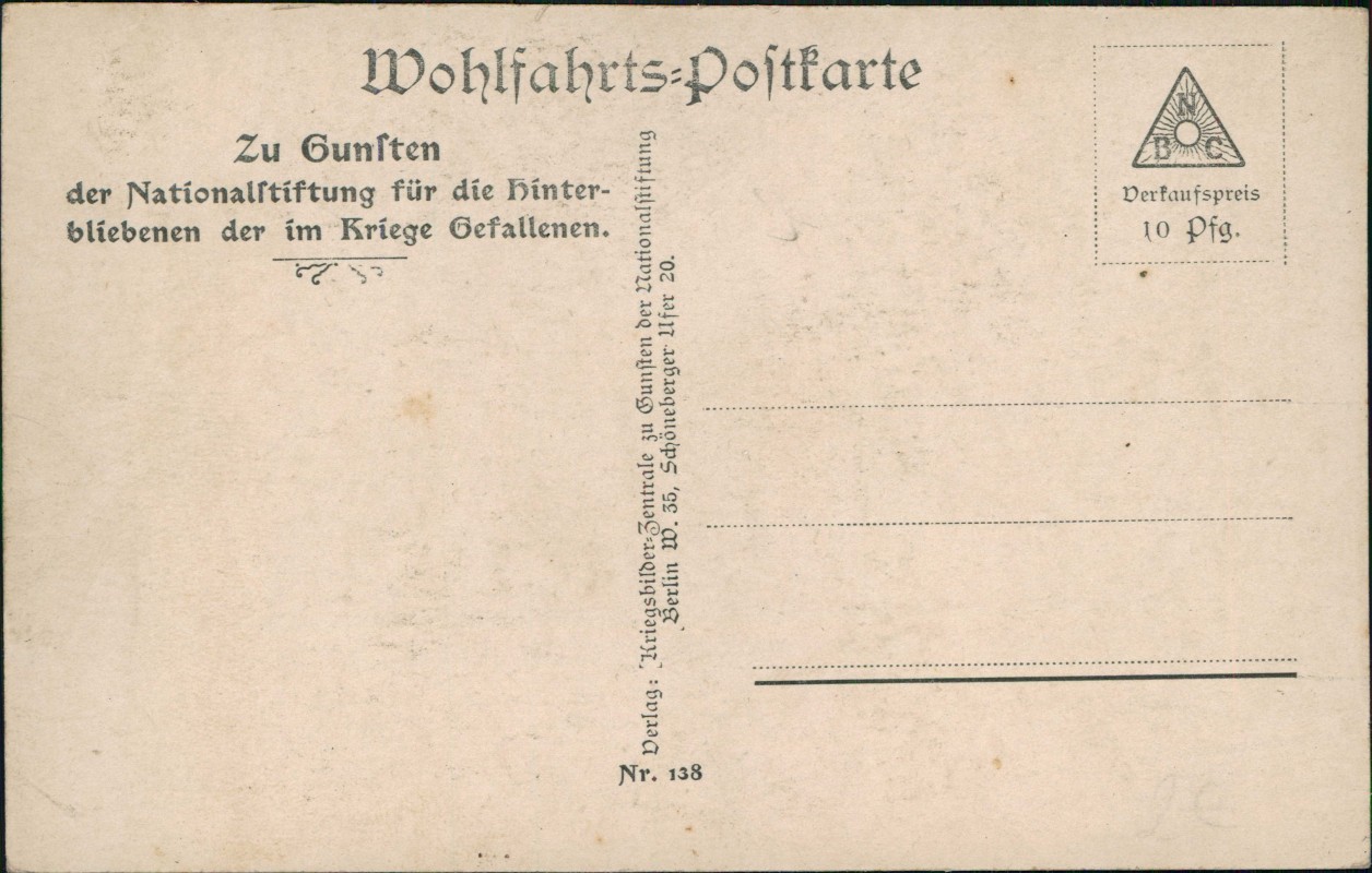 - Kriegsbilder-Zentrale zu Gunsten der Nationalstiftung für die Hinterbliebenen der im Kriege Gefallenen, Berlin W55, Schöneberger Ufer 20.