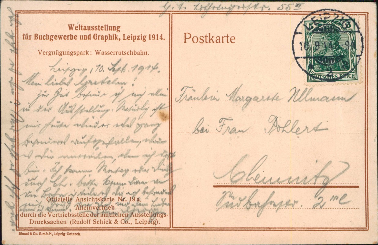 Ansichtskarte: Weltaustellung Buchgewerbe Vergnügungspark: Wasserrutschbahn. - Leipzig