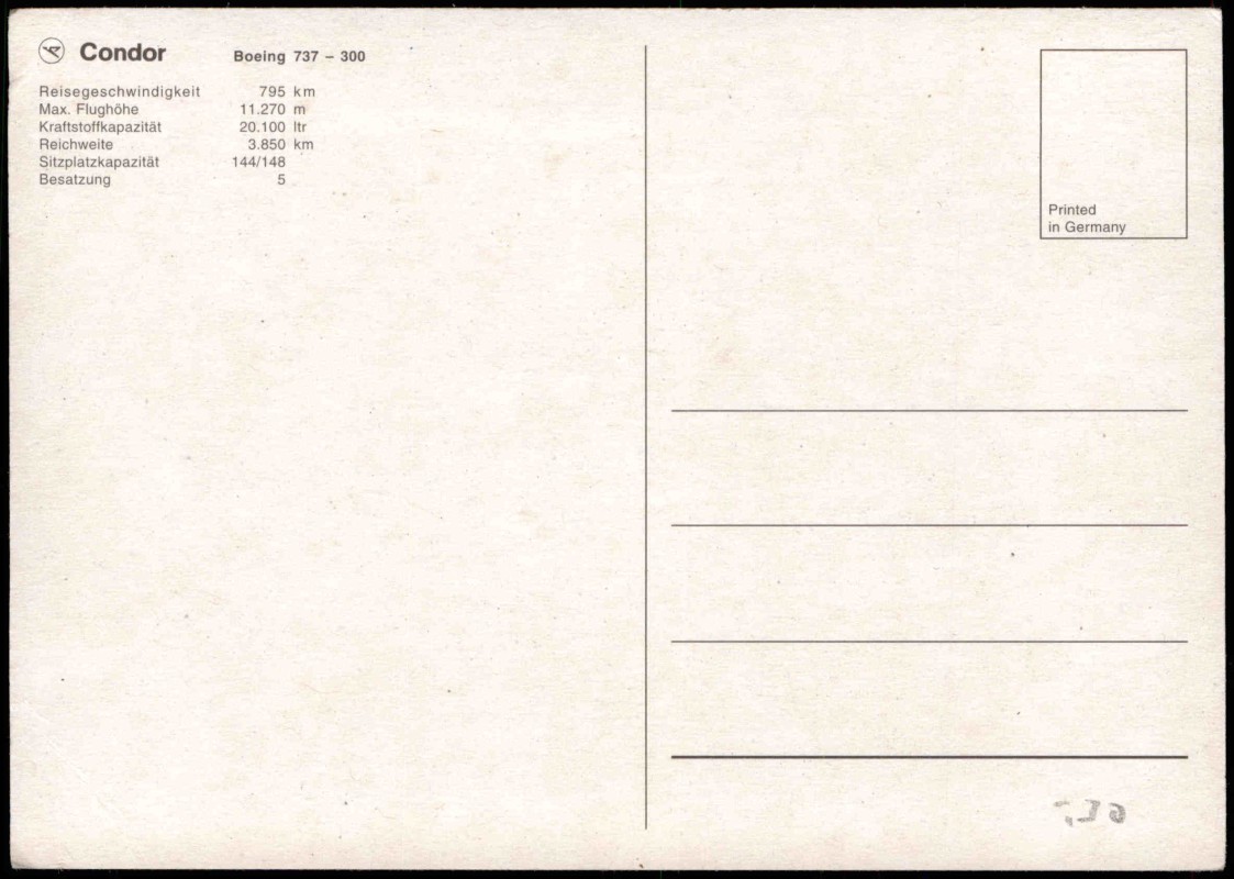 historische Ansichtskarte von 1982: Flugzeug Airplane Avion Condor Boeing 737-300:: Adressseite