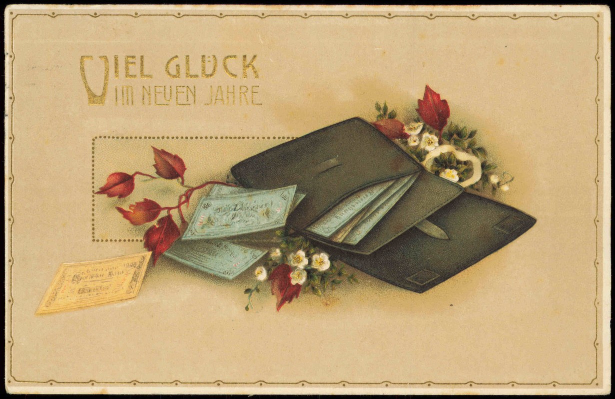Ansichtskarte: Neujahr Sylvester New Year Geldbörse Geldscheine Misteln