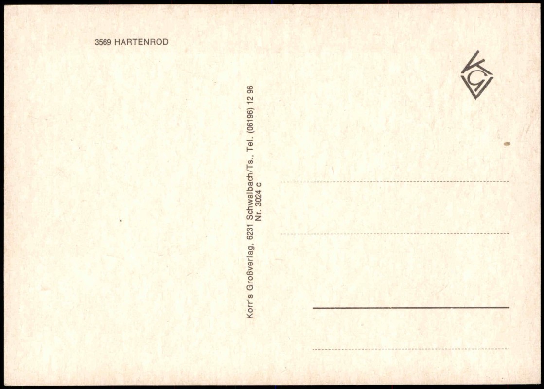 - Mehrbildkarte von Hartenrod. Die Karte zeigt eine Panoramaansicht des Ortes im Schelderwald, eine Detailansicht der Kirche (vermutlich Evangelische Kirche Hartenrod) durch einen Bogen gerahmt, sowie eine Kneipp-Tretstelle mit Sitzbänken und Blumenbeeten. Herausgegeben von Korr's Großverlag, Schwalbach/Ts., mit der Seriennummer 3024 c.