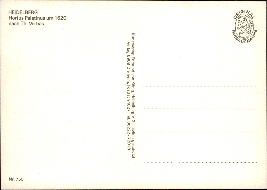 Ansichtskarte: Umland-Ansicht Hortus Palatinus um 1620 nach Th. Verhas (Künstler) - Heidelberg