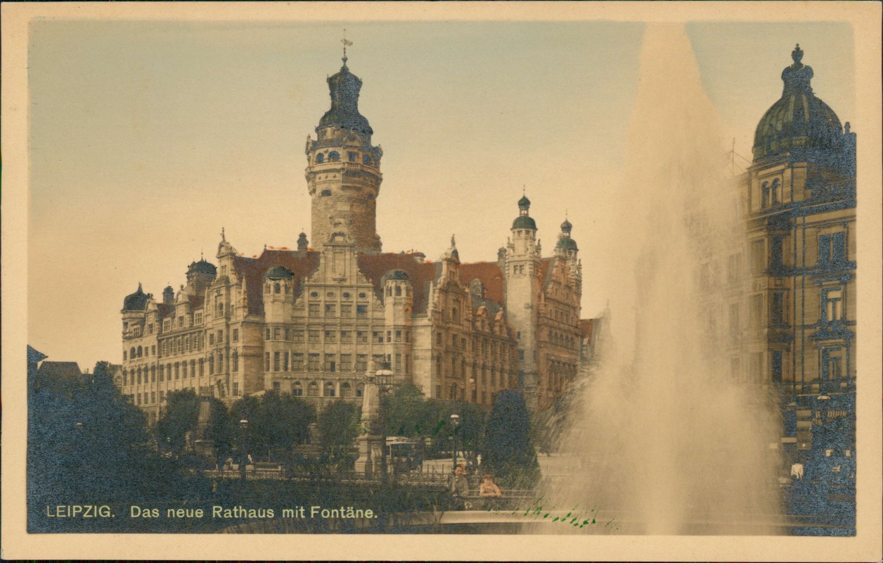 Ansichtskarte: Das neue Rathaus mit Fontäne - Leipzig
