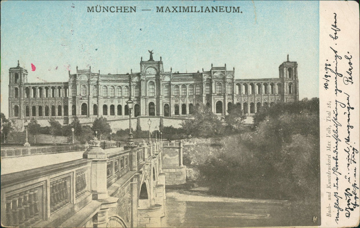 historische Ansichtskarte von 1899: Maximilianeum Brücke und Gebäude-Ansicht:: Haidhausen-München Adressseite
