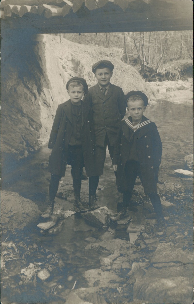 Foto Karte: Kinder Jungen im Bach - Mode Kleidung Zeitgeschichte