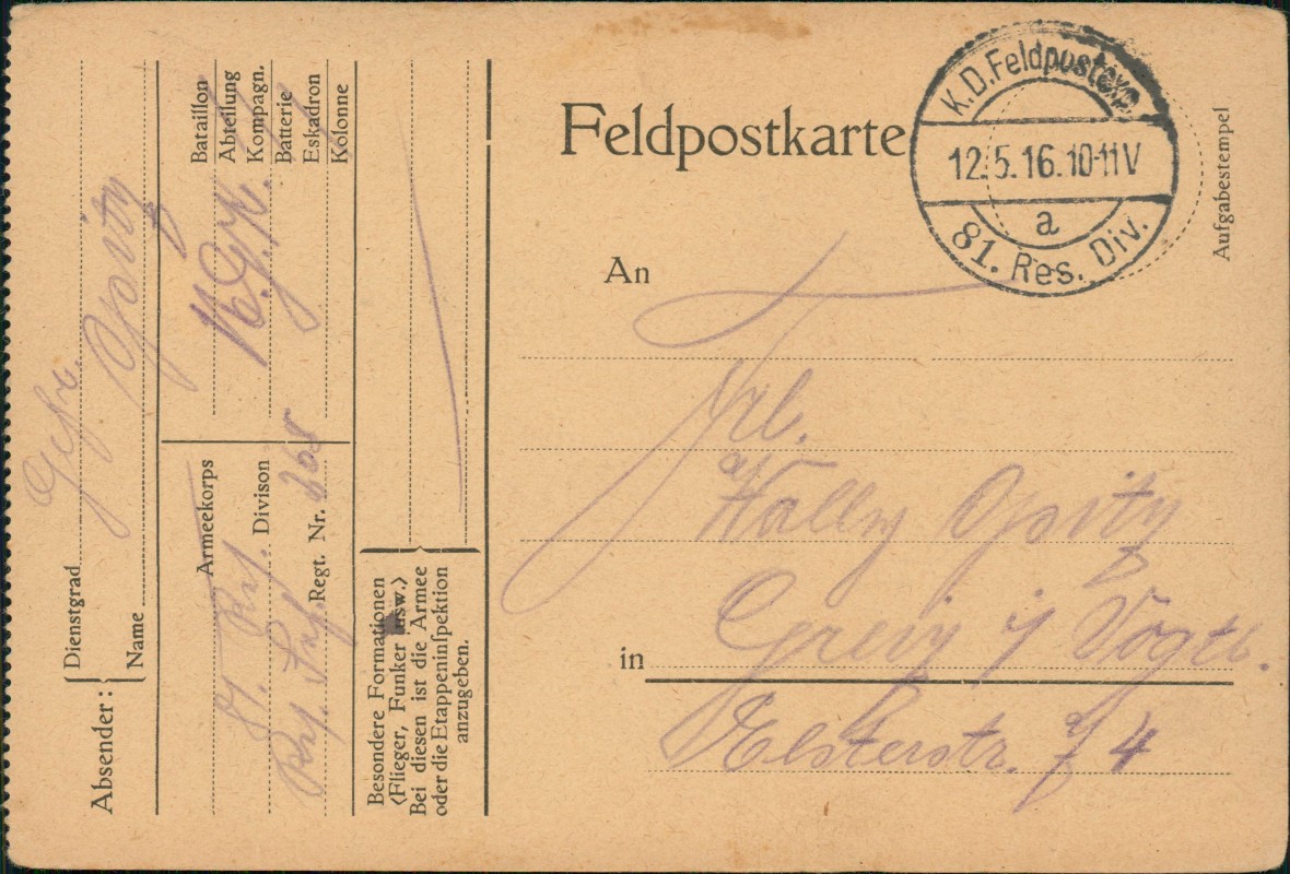 - Feldpostkarte 1. WK K.D. Feldpost S 1 Res. Div.