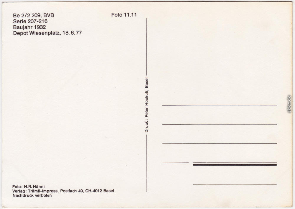 Foto Karte: Straßenbahn Be 2/2 209 BVB vor Depot Wiesenplatz - Basel
