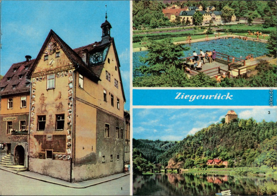 Ansichtskarte: Rathaus, Bad, Jugendherberge Theo Neubauer - Ziegenrück/Saale