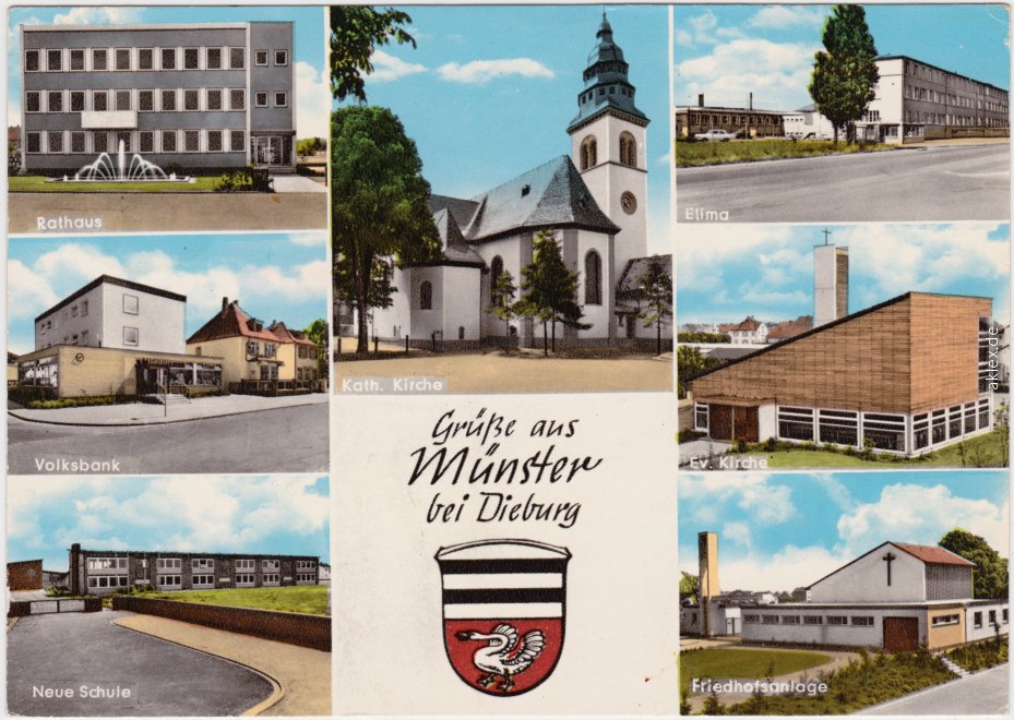 Ansichtskarte: Volksbank, Schule, Elima, Friedhofsanlage, Kirche - Münster