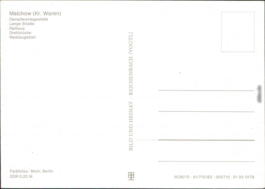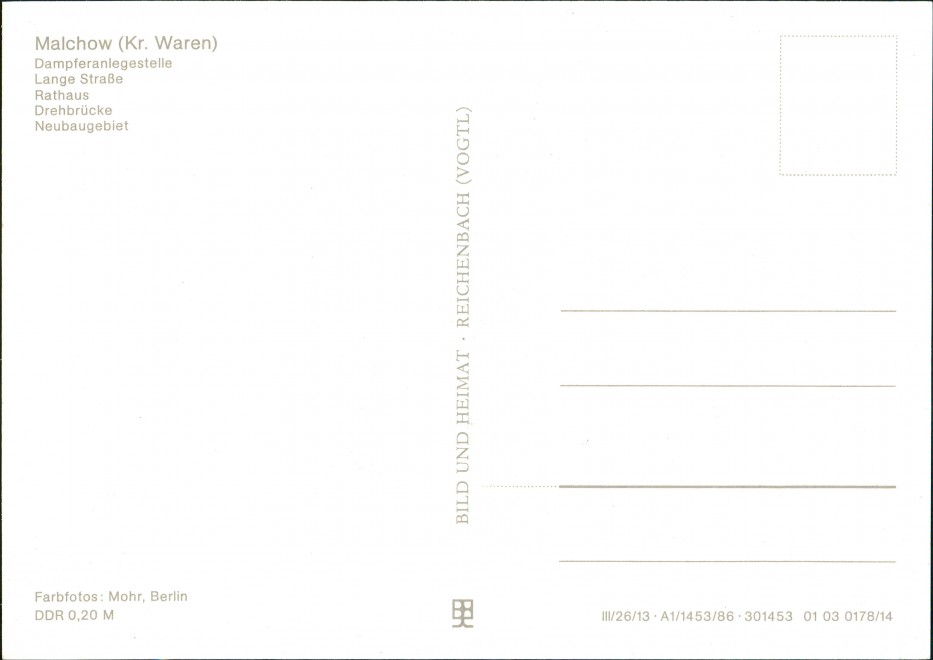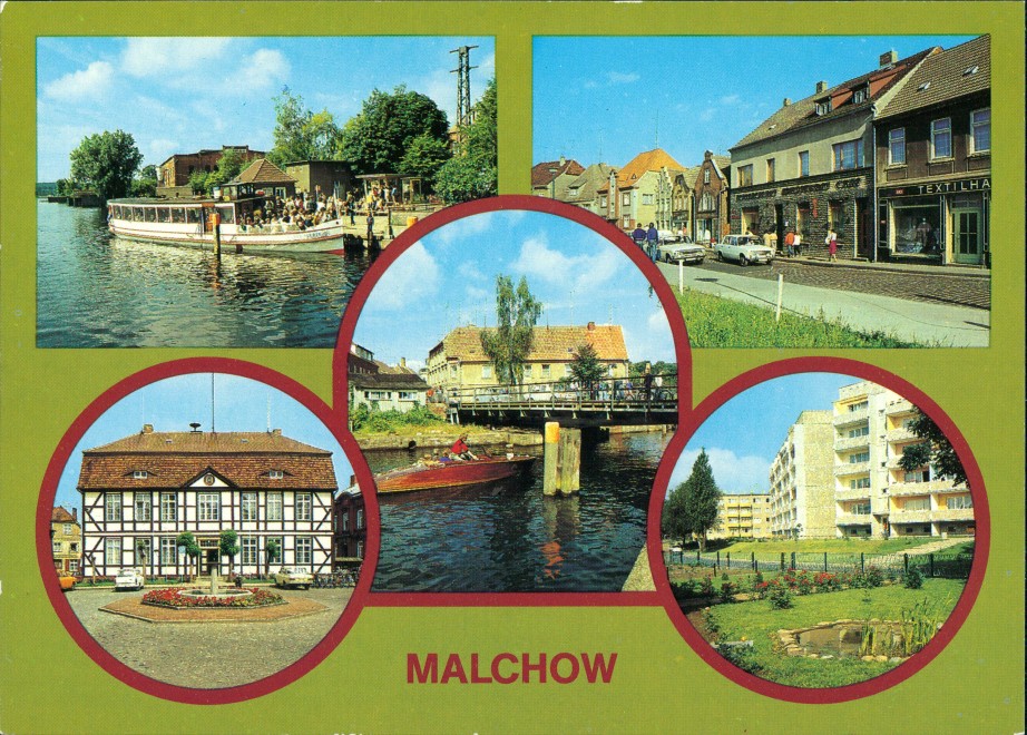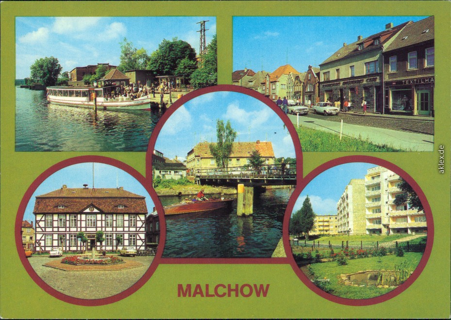 Ansichtskarte: Dampferanlegestelle, Lange Straße, Rathaus, Drehbrücke, Neubaugebiet - Malchow (Mecklenburg)