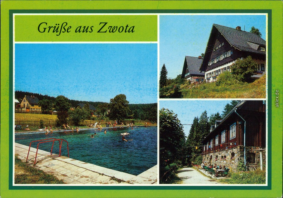 Ansichtskarte: Freibad, Teilansicht, Jugendherberge - Zwota
