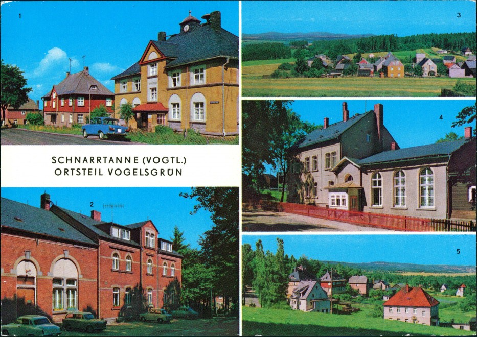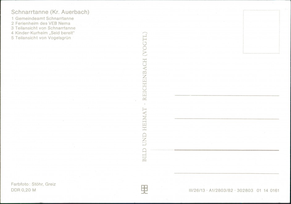 Ansichtskarte: Gemeindeamt, Ferienheim des VEB Nema, Überblick, Kinder-Kurheim Seid bereit, Teilansicht von Vogelsgrün - Schnarrtanne (Vogtland)