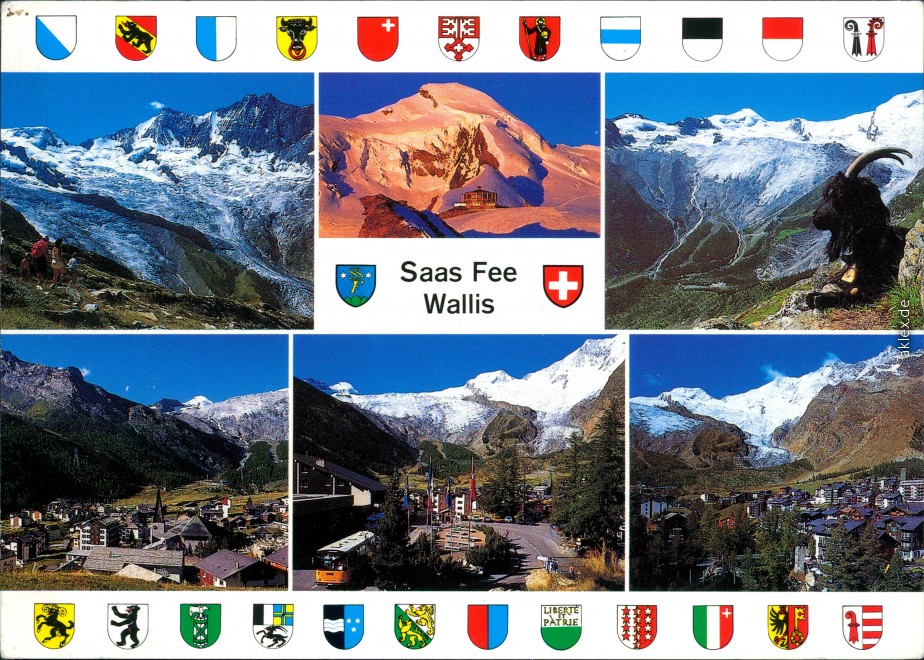 Ansichtskarte: Bergmassiv, Bergbaude, Panorama, Ortsmotive - Saas-Fee