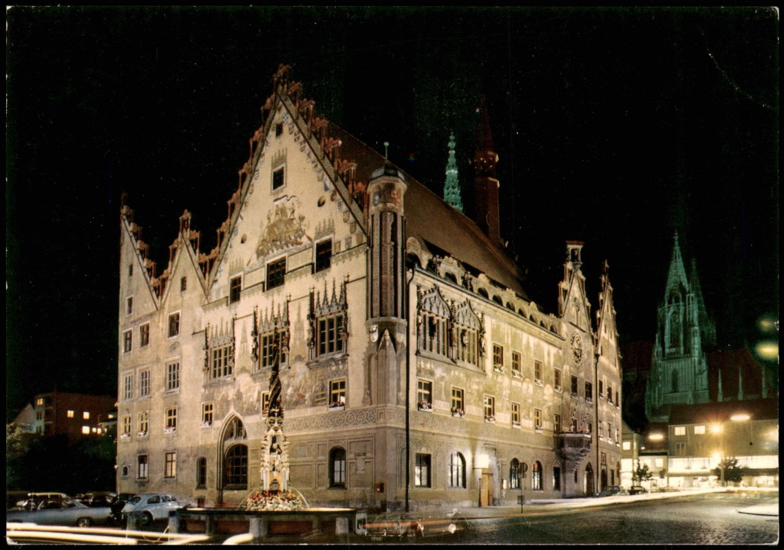 Foto Karte: Rathaus (Spätgotik) am Abend / bei Nacht - Ulm a. d. Donau