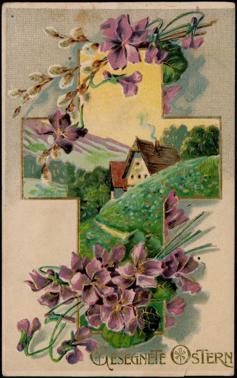 Ansichtskarte: Glückwunsch Ostern / Easter Kreuz Feilchen - Landschaft