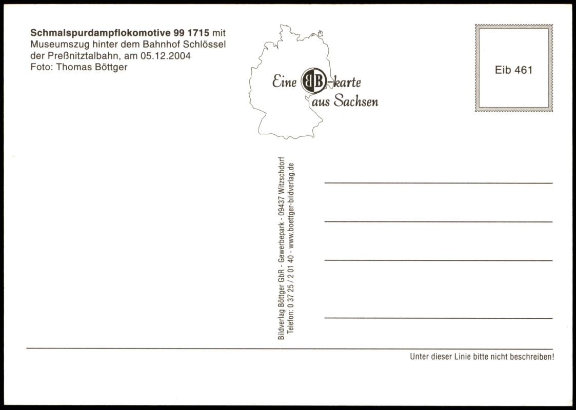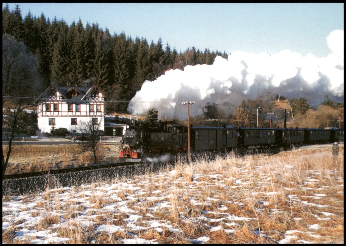 Foto Karte: Schmalspurdampflokomotive mit Museumszug hinter Bahnhof Schlössel Preßnitztalbahn