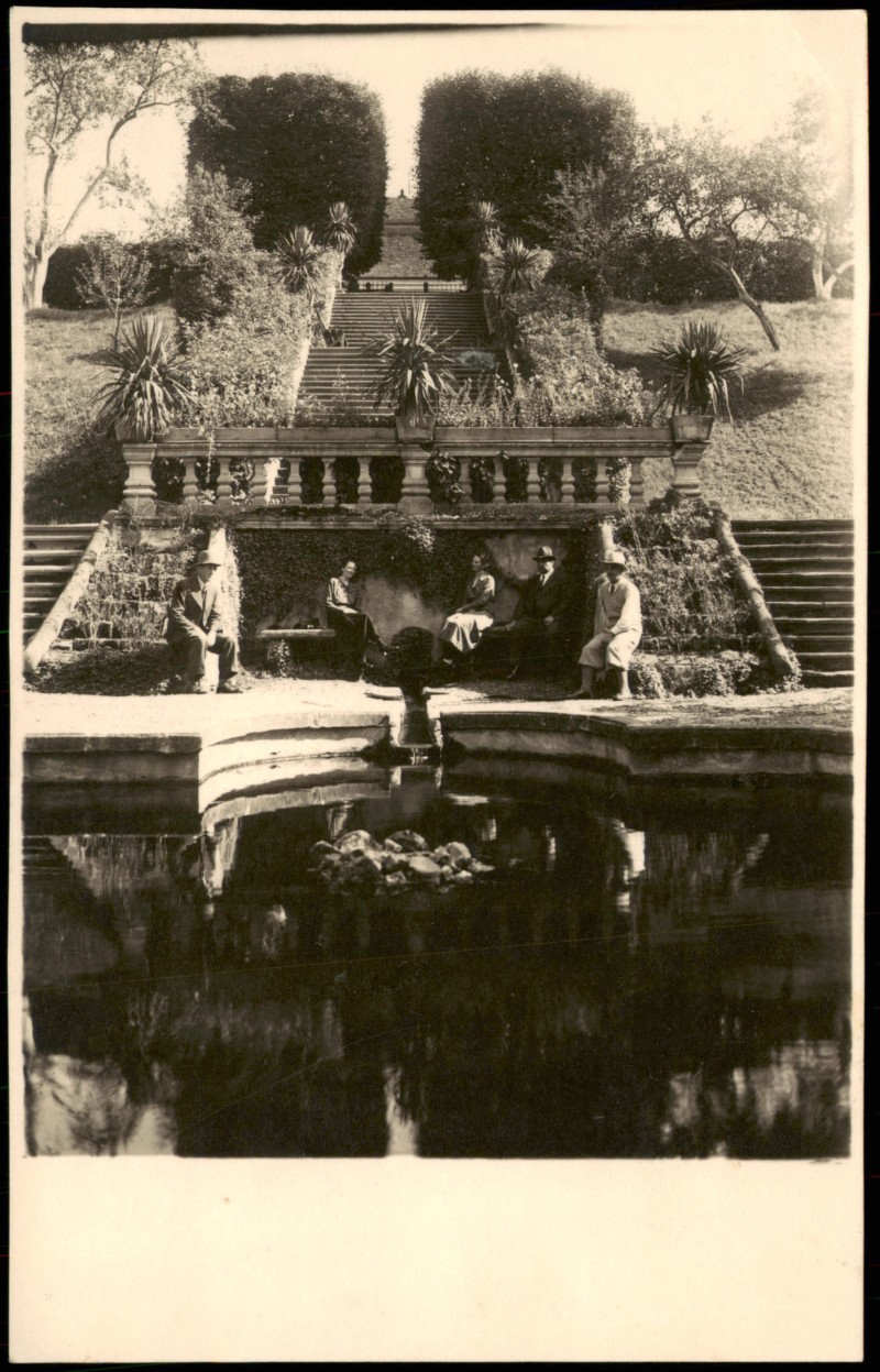 Ansichtskarte: Parktreppe mit Springbrunnen, Palmen, Menschen - Freck