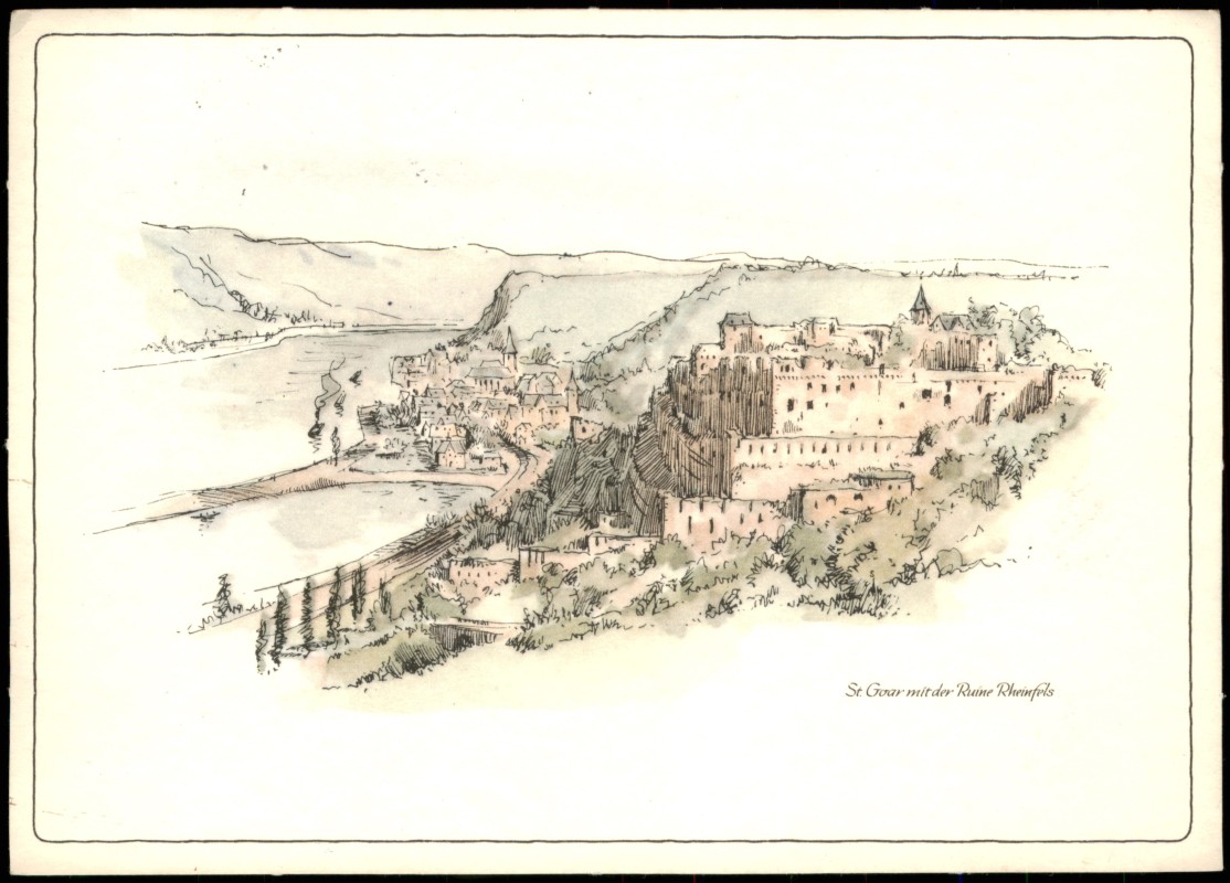 - Panorama-Ansicht mit der Ruine Rheinfels (Künstlerkarte)