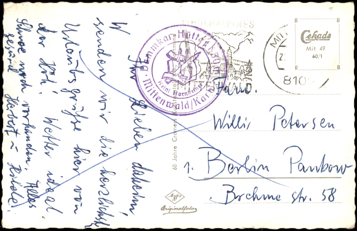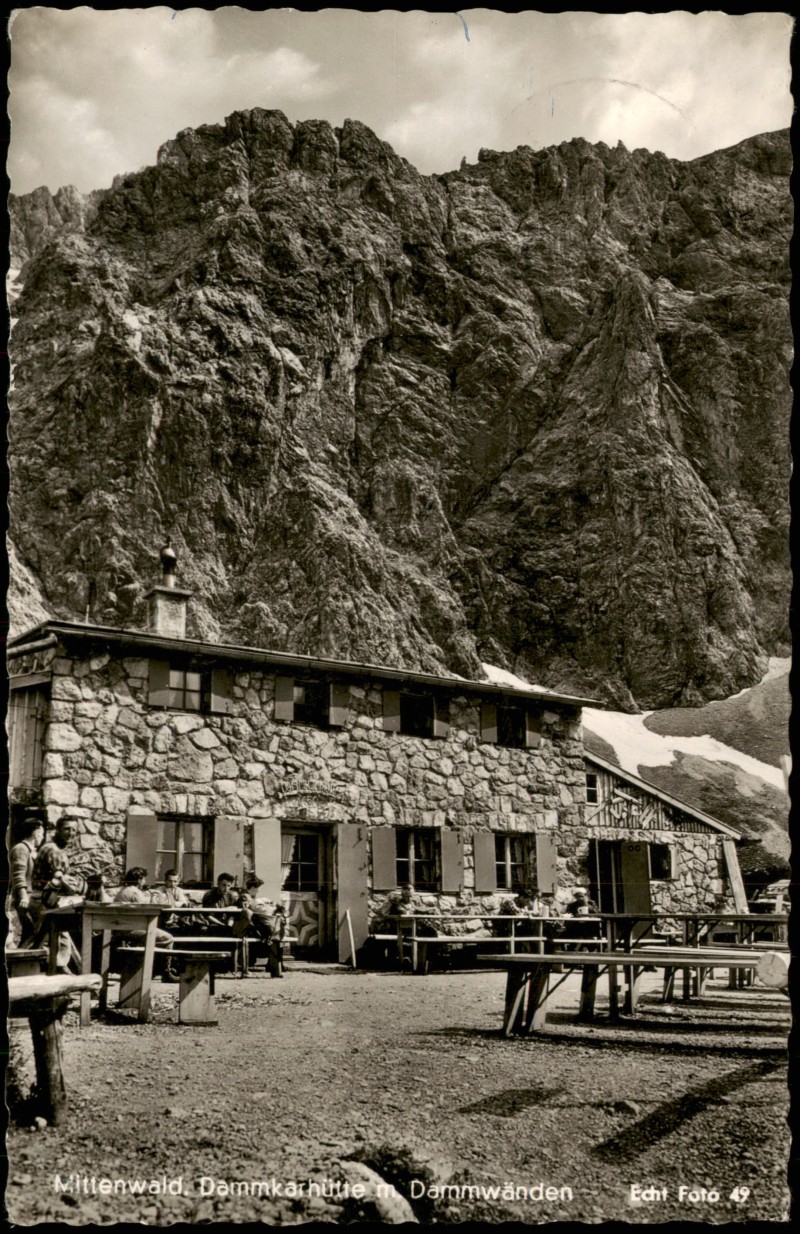Ansichtskarte: Dammkarhütten Darmwänden - Wanderer - Mittenwald