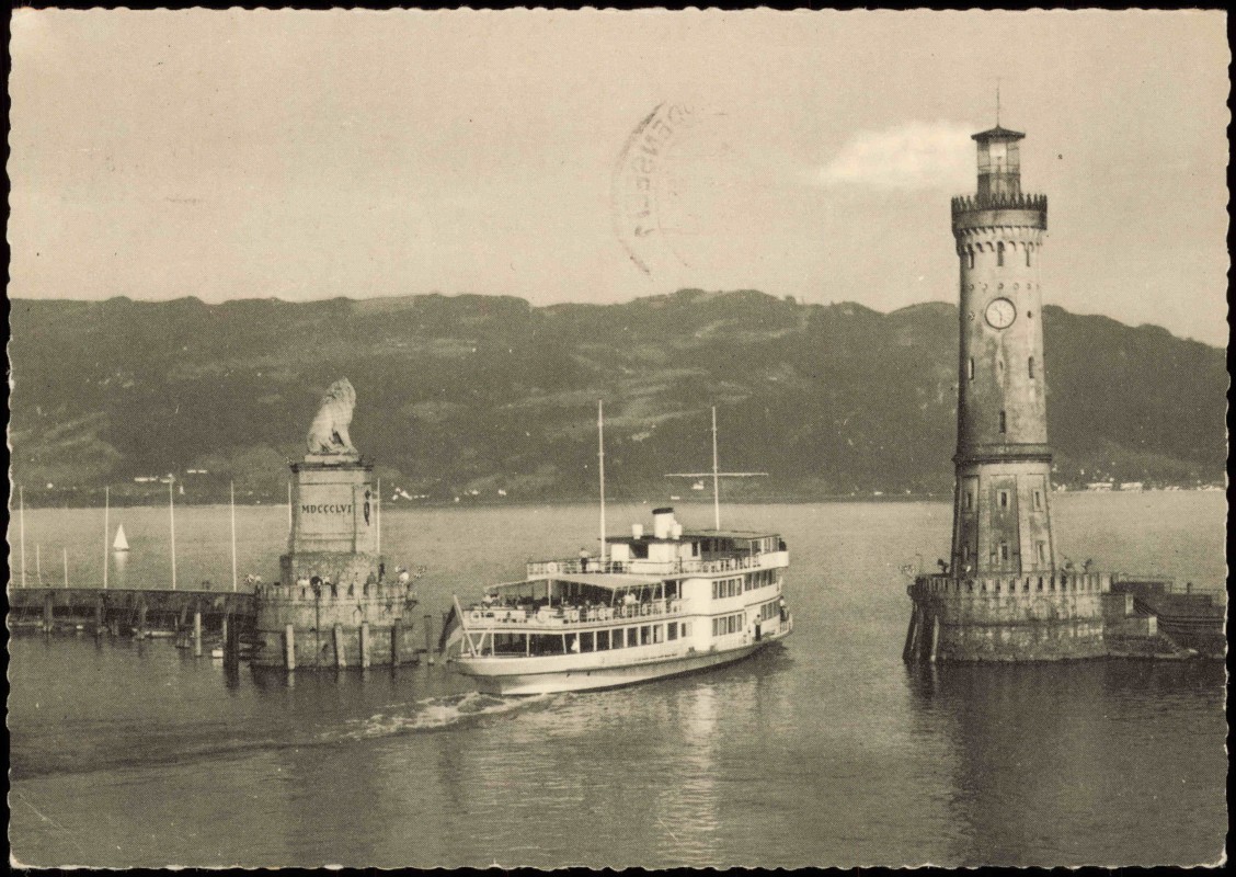 Foto Karte: Hafen Hafeneinfahrt Bodensee-Schiff Dampfer ausfahrend - Lindau (Bodensee)