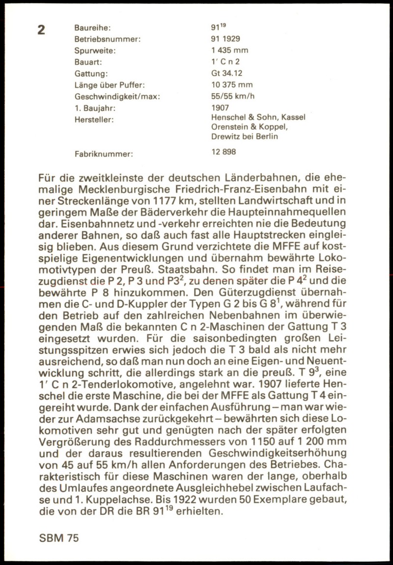 - 91 1929 2 Baureihe: 9119 Betriebsnummer: 91 1929 Spurweite: 1 435 mm Bauart: 1' Cn 2 Gattung: Gt 34.12 Länge über Puffer: 10 375 mm Geschwindigkeit/max: 55/55 km/h 1. Baujahr: 1907 Hersteller: Henschel & Sohn, Kassel Orenstein & Koppel, Drewitz bei Berlin Fabriknummer: 12 898 Für die zweitkleinste der deutschen Länderbahnen, die ehe- malige Mecklenburgische Friedrich-Franz-Eisenbahn mit einer Streckenlänge von 1177 km, stellten Landwirtschaft und in geringem Maße der Bäderverkehr die Haupteinnahmequellen dar. Eisenbahnnetz und -verkehr erreichten nie die Bedeutung anderer Bahnen, so daß auch fast alle Hauptstrecken eingleisig blieben. Aus diesem Grund verzichtete die MFFE auf kostspielige Eigenentwicklungen und übernahm bewährte Loko- motivtypen der Preuß. Staatsbahn. So findet man im Reisezugdienst die P2, P3 und P32, zu denen später die P 4² und die bewährte P 8 hinzukommen. Den Güterzugdienst übernahmen die C- und D-Kuppler der Typen G 2 bis G 81, während für den Betrieb auf den zahlreichen Nebenbahnen im überwiegenden Maß die bekannten C n 2-Maschinen der Gattung T 3 eingesetzt wurden. Für die saisonbedingten großen Leistungsspitzen erwies sich jedoch die T 3 bald als nicht mehr ausreichend, so daß man nun doch an eine Eigen- und Neuentwicklung schritt, die allerdings stark an die preuß. T 93, eine 1' Cn 2-Tenderlokomotive, angelehnt war. 1907 lieferte Henschel die erste Maschine, die bei der MFFE als Gattung T 4 eingereiht wurde. Dank der einfachen Ausführung-man war wieder zur Adamsachse zurückgekehrt - bewährten sich diese Lokomotiven sehr gut und genügten nach der später erfolgten Vergrößerung des Raddurchmessers von 1150 auf 1 200 mm und der daraus resultierenden Geschwindigkeitserhöhung von 45 auf 55 km/h allen Anforderungen des Betriebes. Cha- rakteristisch für diese Maschinen waren der lange, oberhalb des Umlaufes angeordnete Ausgleichhebel zwischen Laufach- se und 1. Kuppelachse. Bis 1922 wurden 50 Exemplare gebaut, die von der DR die BR 9119 erhielten.